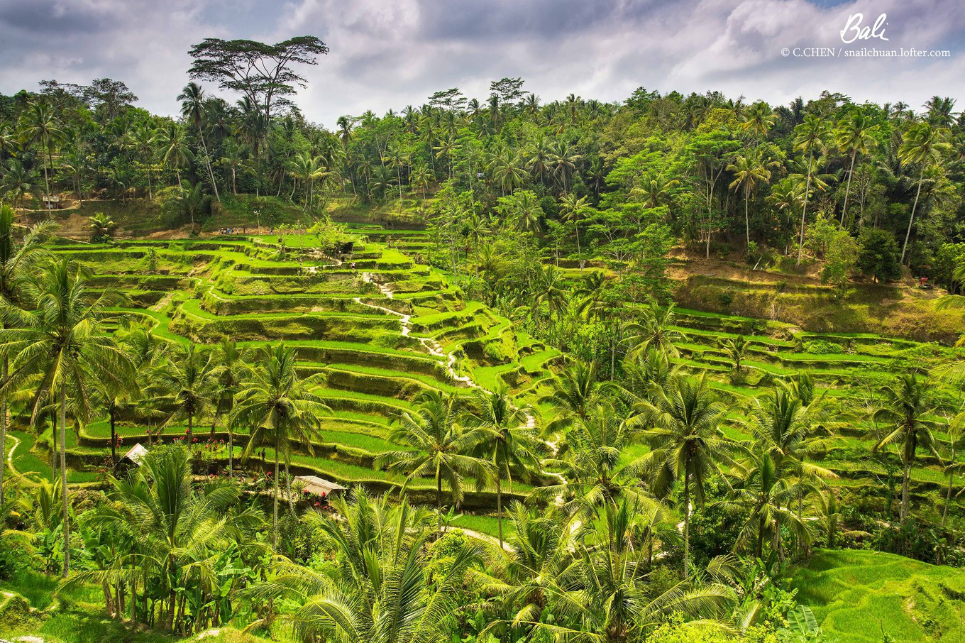 层层叠叠的梯田和特色巴厘岛民居点缀其中,椰林与稻田结合具有当地特色。
