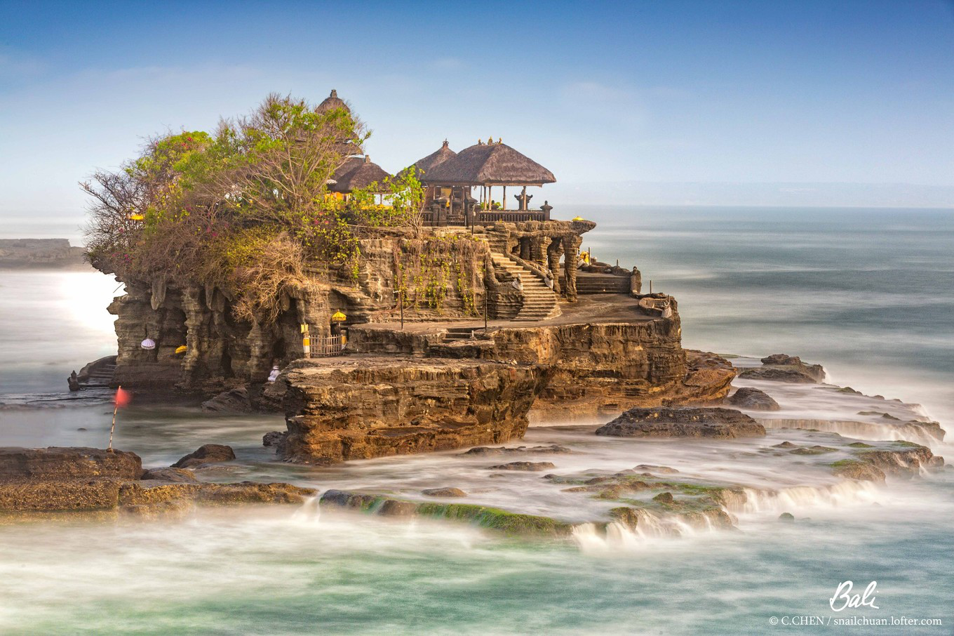 巴厘岛最重要的海边庙宇,潮涨的时候,寺庙与陆地隔绝地矗立在海水中非常壮观,当地人会在额头上黏米去做仪式。
